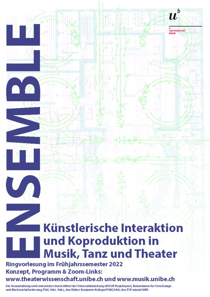 Gemeinsam mit Kolleg*innen aus dem akademischen Mittelbau der Institute für Theater- und Musikwissenschaft an der Universität Bern habe ich für das Frühjahrssemester 2022 eine Ringvorlesung mit dem Titel „ENSEMBLE. Künstlerische Interaktion und Koproduktion in Musik, Tanz und Theater“ organisiert. Ich denke, dass es uns gelungen ist, ein spannendes Vortragsprogramm mit Gastreferent*innen aus verschiedenen Disziplinen zusammenzustellen und ich freue mich sehr auf das kommende Semester. Alle wichtigen Informationen zur Hybridveranstaltung, die über Zoom für alle Interessierten offen steht, finden sich auf den Websites der Institute.