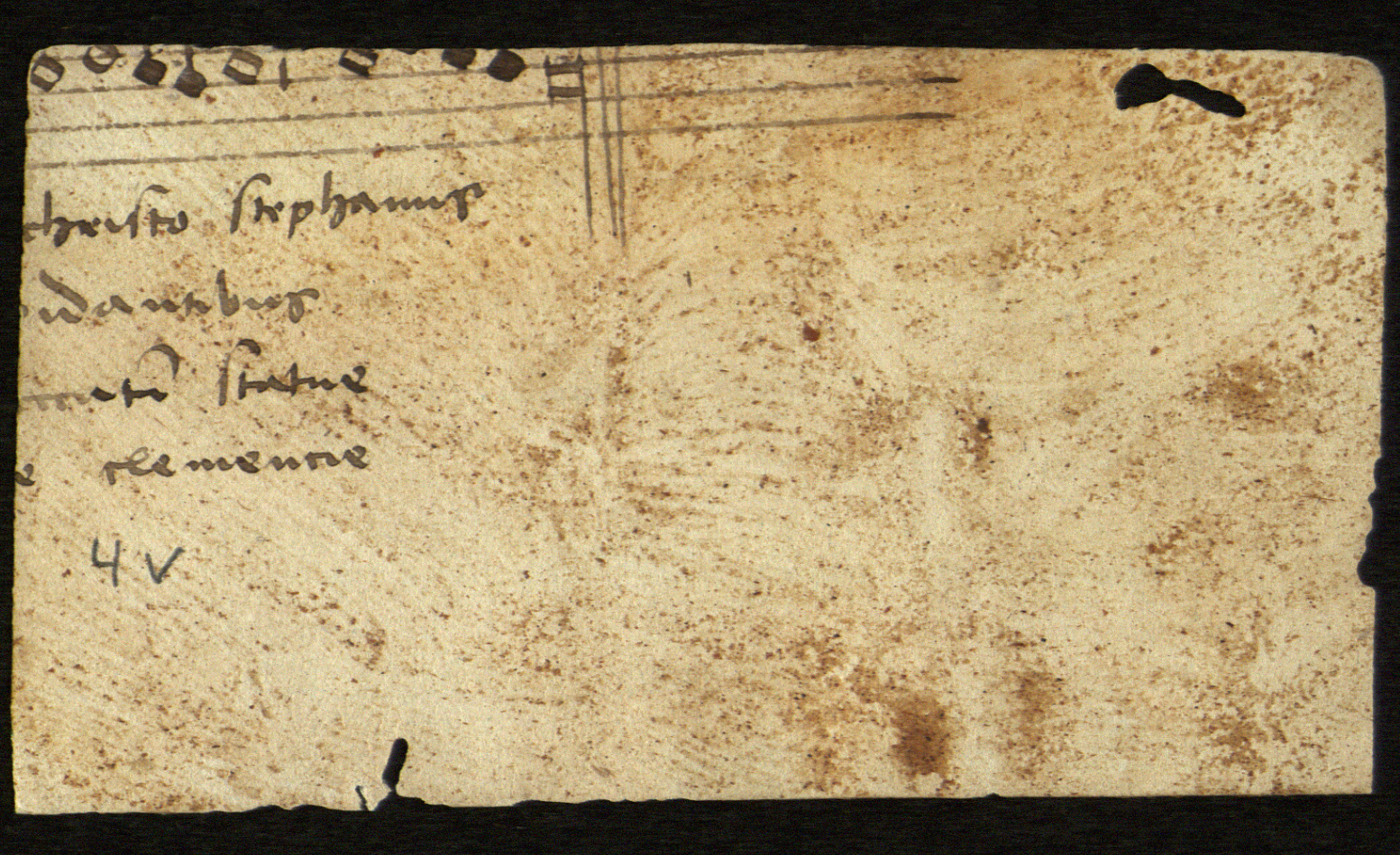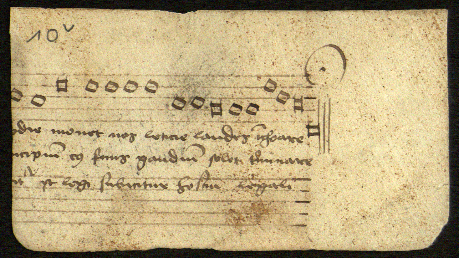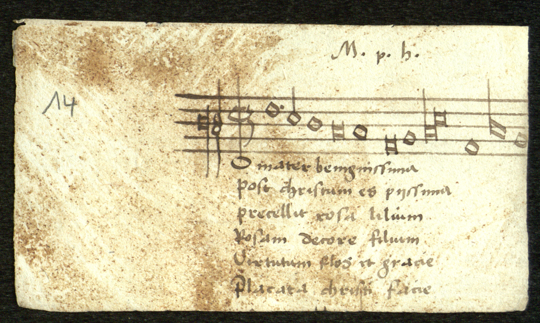 The text on 14r and 4r (in that order) is a variant of the Marian hymn “Virgo mater piissima, cunctorum plasmatoris,” in Dreves, Analecta hymnica vol. 45, p. 151, Nr. 182. I have reconstructed the text on the basis of Dreves, though the original was almost certainly different in detail from what Dreves gives. Since 14r and 4r both set the same text, it seems likely that these two pages were originally from the same opening. On the basis of the amount of text missing, I would estimate that there was another one or two openings of music after 4r.