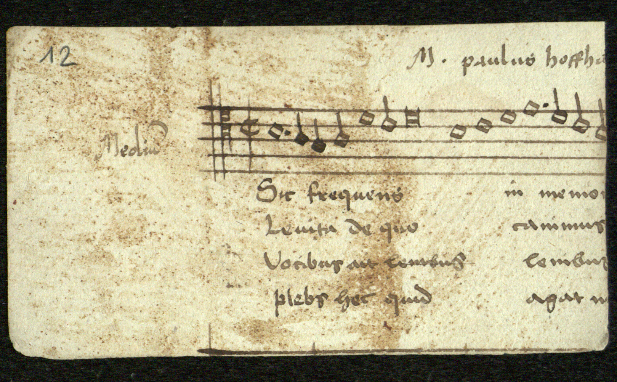 | 12r | M. paulus hoffhe[immer] | C4 | Sic frequens in memo[???] | 4 strophes „Medium“ |