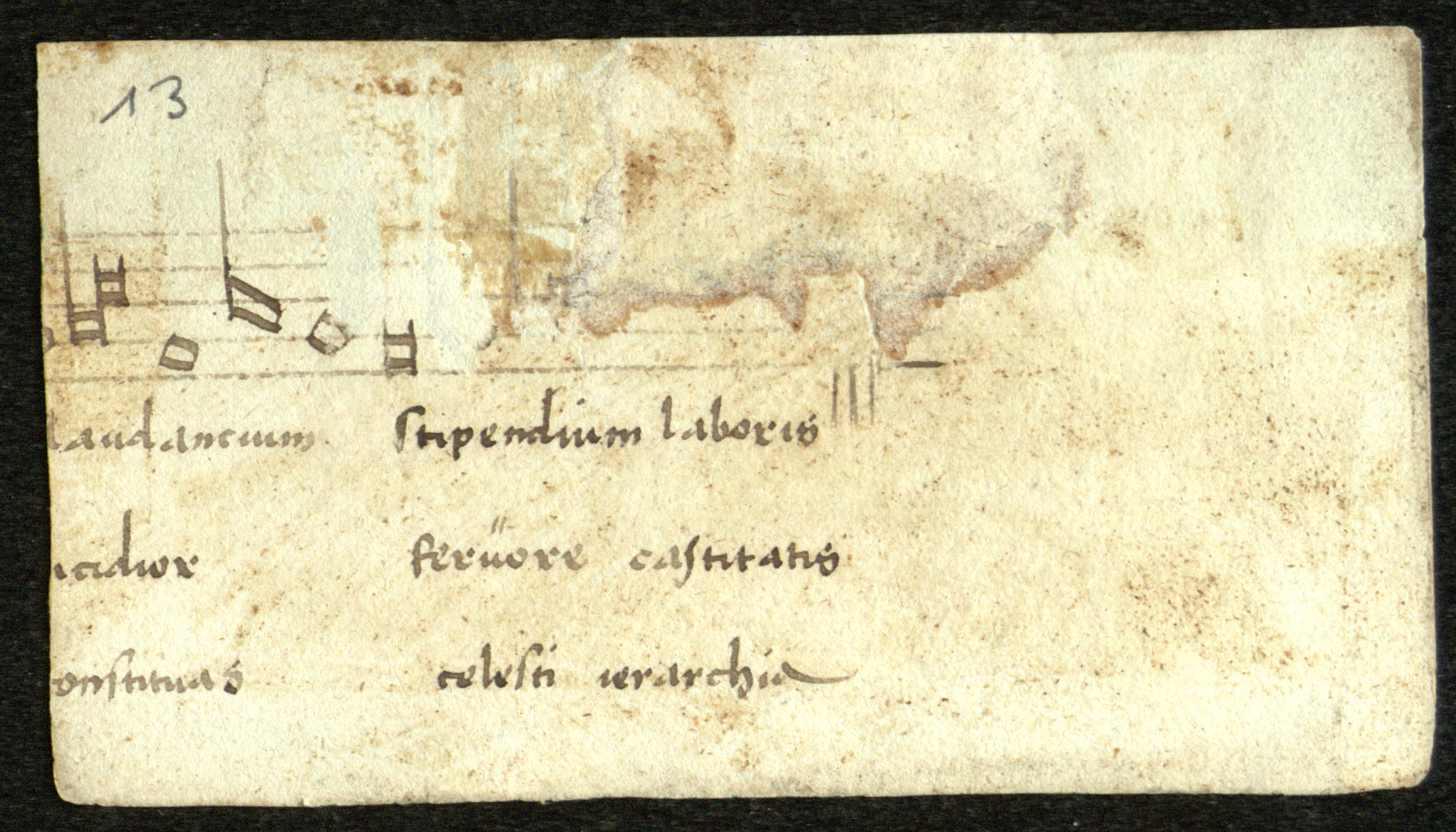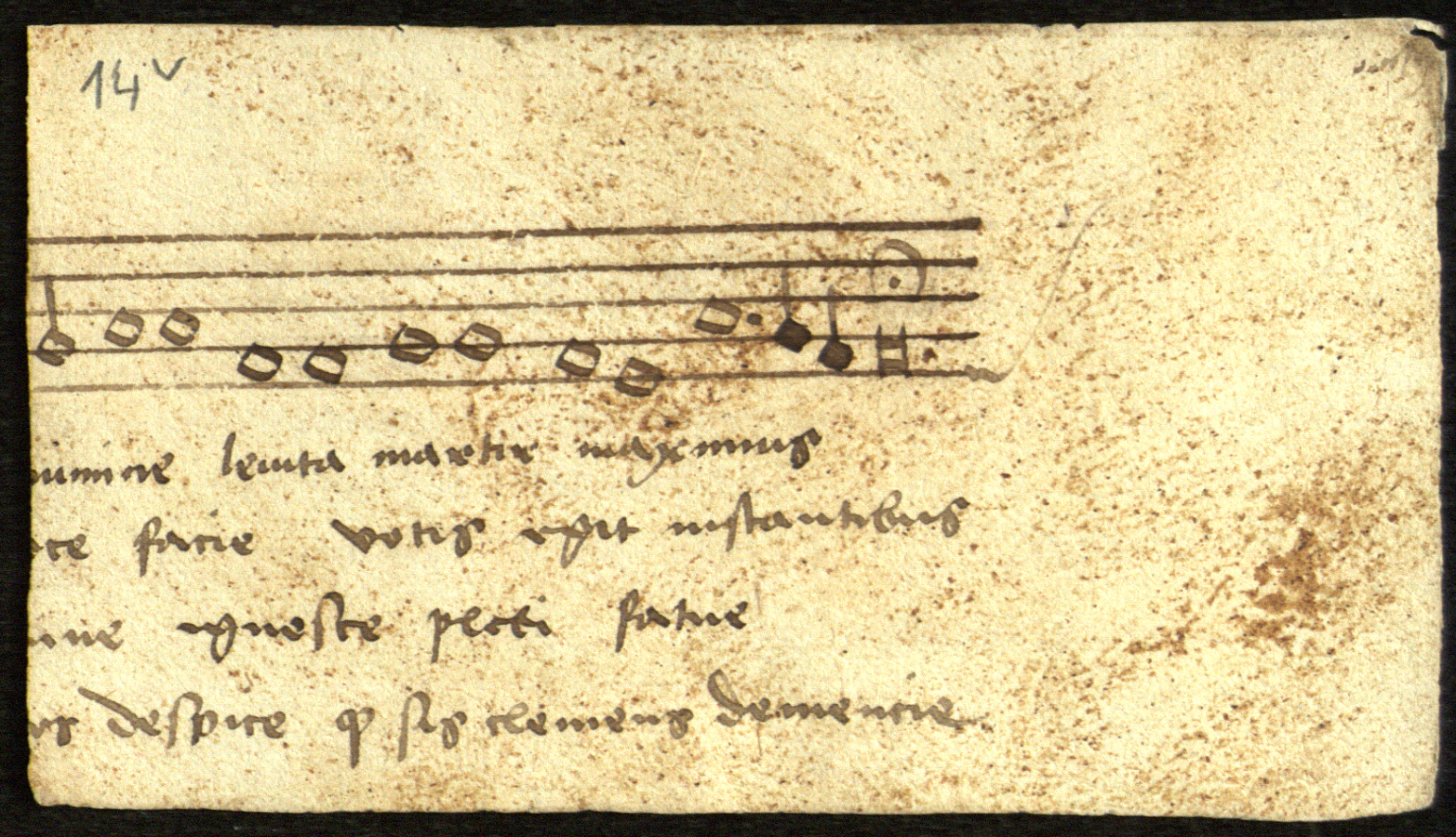 The word “levita” (priest or deacon) occurs on 12r and 14v, which suggests that these fragments belong to the same piece. I wonder if this might be a hymn for St Stephen’s day.